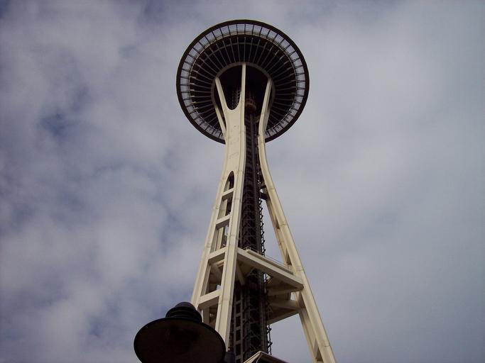 Keywords: space needle seattle skyline city downtown tower view tall clouds building blue skyscraper window