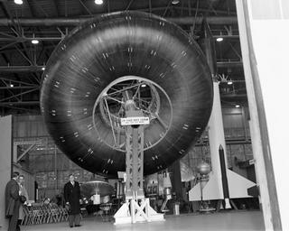 | Keywords: inflatable space stations inflatablespacestations langley models monochrome blackandwhite black and white A model of an inflatable space station concept with a solar power system collector in 1961. It was 24 feet in diameter with internal fabric bulkhead which could be separately pressurized in an emergency. A model of an inflatable space station concept with a solar power system collector in 1961. It was 24 feet in diameter with internal fabric bulkhead which could be separately pressurized in an emergency. |