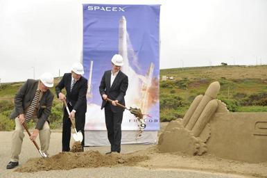 | Keywords: SpaceX breaks ground at Vandenberg Air Force Base.jpg en VANDENBERG AIR FORCE BASE Calif -- Lompoc Mayor John Linn Elon Musk the founder and chief executive officer of SpaceX and California Lt Govenor Gavin Newsom shovel sand during the ground breaking ceremony at Space Launch Complex 4 East here Wednesday July 14 2011 SpaceX has plans to launch their Falcon Heavy from Vandenberg in 2013 U S Air Force photo/Staff Sgt Andrew Satran 2011-06-14 http //www vandenberg af mil/shared/media/photodb/photos/110713-F-CY114-073 jpg Staff Sgt Andrew Satran PD-USGov Uploaded with UploadWizard Elon Musk Ground-breaking ceremonies in the United States Falcon Heavy Vandenberg Air Force Base Space Launch Complex 4 |