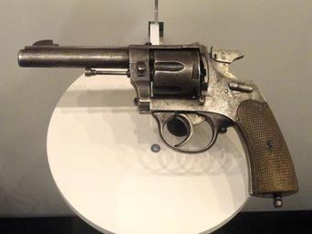 | Keywords: Spain revolver, Model 1915, made under contract for French Army - National World War I Museum - Kansas City, MO - DSC07478.JPG Handgun exhibited in the National World War I Museum at the Liberty Memorial 100 W 26th Street Kansas City Missouri USA Photography was permitted in the museum without restriction Daderot 2011-11-01 13 43 39 Daderot Handguns in the National World War I Museum Revolvers in museums Weapons of Italy Infantry weapons of World War I | ||||