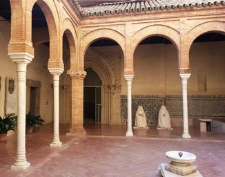 Keywords: spain seville statues kneeling cloister colonnade bricks silence reverence