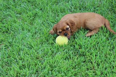 Keywords: spaniel dog cavalier puppy cute ball yellow green grass pet