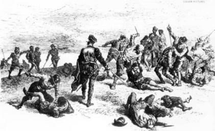 | Keywords: Spanish slaughtering French Huguenots.jpg en It was Saturday the 29th of September the feast of St Michael; the sun had already set when the Frenchmen reached the mark drawn in the sand near the banks of the lagoon and the orders of Menéndez to kill the Huguenots were executed 2014-03-18 21 29 20 Florida Memory http //floridamemory com/items/show/2841 author Custom license marker 2014 03 19 PD-old-100 Uploaded with UploadWizard History of Florida | ||||