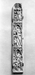 | Keywords: Spanish - Wing of a Folding Tabernacle with Scenes of the Passion - Walters 71176.jpg This plaque along with Walters 71 175 are the only surviving ivories from a folding tabernacle that contained a Crucifixion They are of unusually tall form and combine features of the Rose Group in the bands of roses that divide the scenes horizontally with trefoil arches flanked by rosettes The placement of this wing in the shrine was second from the left This wing is carved from bottom to top with the Arrest of Christ Carrying of the Cross and Three Marys at the Tomb The wing is hinged on both sides with diagonally set iron hinges While a couple of iconographical rarieties exist in the scenes on Walters 71 175 the scenes on this wing are typical of Rose Group ivories A Parisian work may have served as the model The carving here is very uneven in quality The enframements are unusual and the form of a tabernacle for a central Crucifixion group is unique These features combined with the use of iron hinges suggest a non-French center The frequent use in Spain of tabernacle enclosures for sculpture would seem to confirm a Spanish attribution Both plaques have suffered from exposure They have been cut horizontally at the top and the remaining hinges have rusted and broken the ivory There are iron nails centrally placed in the trefoil arches of three scenes Each plaque is inscribed on the back 8809/R-73101/las dos tiras between 1300 1330 Medieval ivory cm 28 7 4 6 accession number 71 176 25537 Spain Léon Gruel Paris date of acquisition unknown by purchase in Spain Henry Walters city Baltimore Walters Art Museum Henry Walters Acquired by Henry Walters 1923 Transcription On back 8809/R-73101/las dos tiras place of origin Spain Walters Art Museum license Medieval ivory in the Walters Art Museum Art of Spain Media contributed by the Walters Art Museum needs category review |