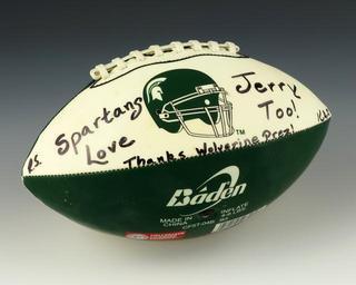 | Keywords: Spartans Football (2007.94).jpg en Green and white football with white laces featuring the Michigan State Spartans logo and helmet printed on it Handwritten text in black marker Red label of Collegiate licensed product Black and white barcode 5 x 8 1/2 in 12 7 x 21 6 cm Institution Gerald R Ford Presidential Museum http //www fordlibrarymuseum gov/museum/ArtifactCollectionSamples/Catagories/Presidential 20Footballs/2007 94 html Spartans Football accession number 2007 94 credit line Courtesy of the Gerald R Ford Presidential Museum Donor Unknown Institution Institution Gerald R Ford Presidential Museum PD-USGov Uploaded with UploadWizard Media contributed by the Gerald R Ford Presidential Library and Museum Footballs in the collection of the Gerald R Ford Presidential Museum American football balls Michigan State Spartans football |