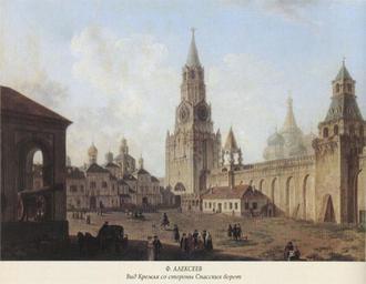 | Keywords: Spasskiye vorota.jpg View from the Kremlin's Spassky Gate Вид Спасских во от в К емле http //grigorius narod ru/rusmoscowpict htm The beginning of the 19 th century Creator Fyodor Alekseyev PD-old-100 Fyodor Alekseyev Moscow Kremlin in art Historical images of Moscow Kremlin |