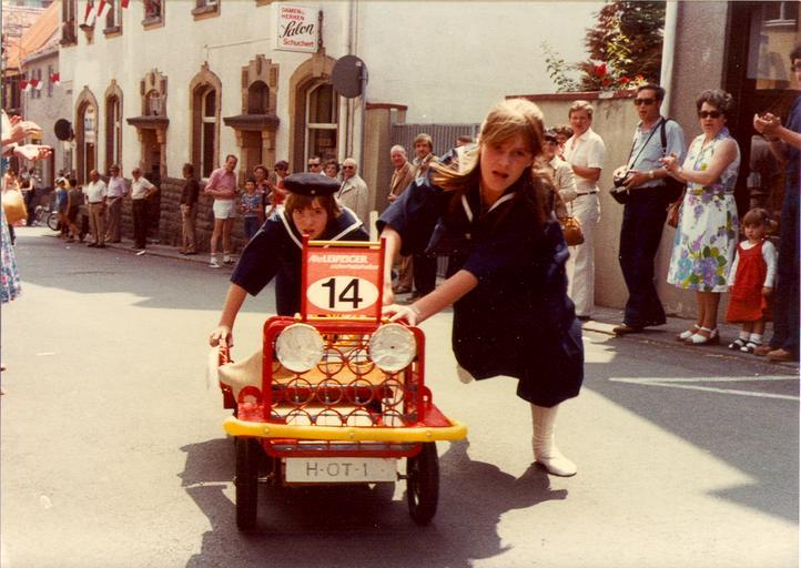 | Keywords: Spassrennen Oberursel 1979.jpg en Kids Race June 1979 in Oberursel Dagmar and Samantha Wynn of Kronberg push their cart out of the Strackgasse to the market place de Kinderautomobilrennen Oberursel 1979 Dagmar und Samantha Wynn aus Kronberg schieben ihre Kiste aus der Strackgasse auf den Marktplatz own ChristophMüllerleile 1979-06 Soap Box Derby Number 14 on racing vehicles Females with land vehicles | ||||