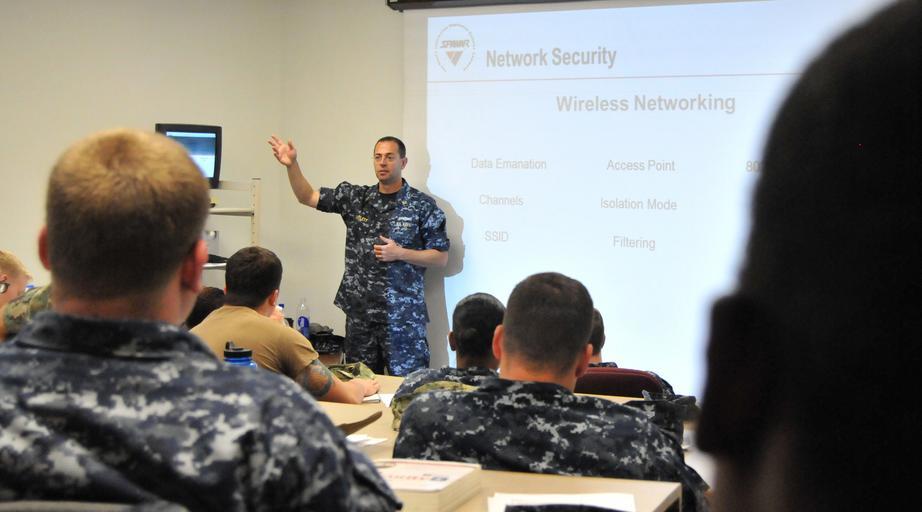 Keywords: SPAWAR teaches ITs for Security Plus certification 130820-N-UN340-003.jpg en Chief Warrant Officer Daryn Bartlett assigned to Space and Naval Warfare Systems Command SPAWAR Reserve Unit 301 Everett Wash teaches a Security Plus certification class to Information Systems Technicians from 11 different San Diego area afloat and shore commands The students will test for Security Plus certification upon completion of the class and if successful will be immediately qualified to begin work on their command servers As the Navy's Information Dominance systems command SPAWAR sends fly-away network operations support teams to fleet units to provide tailored information technology and information assurance/security training required to maintain command control communications computers and intelligence C4I readiness U S Navy photo by Rick Naystatt/Released 2013-08-20 Rick Naystatt https //www dvidshub net/image/1000185 130820-N-UN340-003 2013-08-21 12 48 SAN DIEGO CA US PD-USGov-Military-Navy Space and Naval Warfare Systems Command Images from DoD uploaded by Fæ |