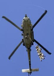| Keywords: Special Purpose Insertion Extraction SPIE.jpg 060923-N-9742R-263 Arabian Sea Sept 23 2006 - Team members of Explosive Ordnance Disposal Mobile Unit Six EODMU-6 Detachment 14 are suspended from an HH-60H Seahawk attached to the Dragonslayers of Helicopter Antisubmarine Squadron One One HS-11 during a Special Purpose Insertion/Extraction SPIE training exercise aboard nuclear-powered aircraft carrier USS Enterprise CVN 65 SPIE is a method to rapidly insert or extract Special Forces from terrain not suitable for helicopter landings in which personnel are suspended from a line attached to a hovering helicopter Enterprise and embarked Carrier Air Wing One CVW-1 are currently on a scheduled six-month deployment in support of Maritime Security Operations and the global war on terrorism U S Navy photo by Mass Communication Specialist 2nd Class Milosz Reterski RELEASED 060923-N-9742R-263 Navy http //www navy mil/view_image asp id 39436 2006-09-23 Mass Communication Specialist 2nd Class Milosz Reterski HH-60H Rescue Hawk United States Navy training Bottom views of helicopters Special Patrol Insertion/Extraction Taken with Nikon D2X PD-USGov-Military-Navy Explosive Ordnance Disposal Mobile Unit 6 Helicopter Anti-Submarine Squadron 11 United States Navy |