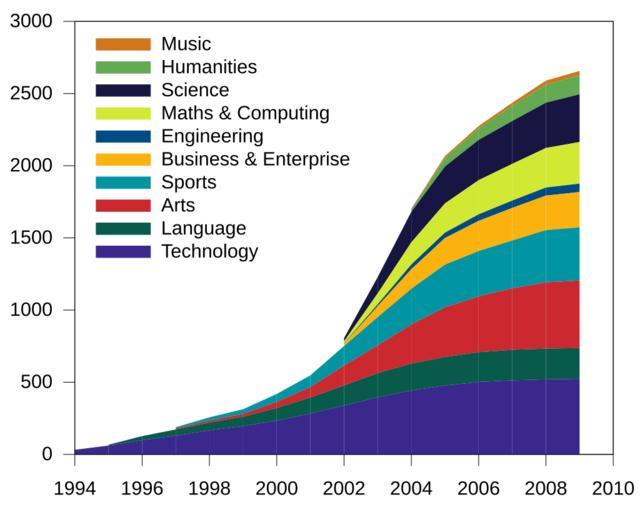 | Keywords: Specialist-schools.svg en Number of specialist schools in England by year and first specialism based on data from http //www standards dfes gov uk/specialistschools/ Specialist Schools The Standards Site Department for Children Schools and Families Own Kanguole 2009-02-21 Schools in England |