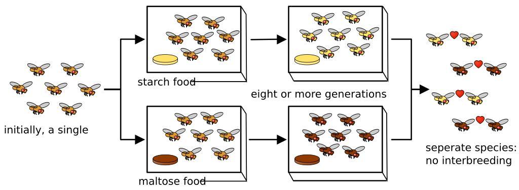 | Keywords: Speciation experiment.svg An experiment demonstrating allopatric speciation in the fruit fly Drosophila pseudoobscura conducted by Diane Dodd A single population of flies was divided into two with one of the populations fed with starch-based food and the other with maltose-based food After the populations had diverged over many generations the groups were again mixed; it was observed that the flies continued to prefer mating with others from the same original population Edited in Inkscape by User BenB4 from Ilmari Karonen's Image Drosophila speciation svg based on http //evolution berkeley edu/evolibrary/images/evo/drosophila_experiment gif from http //evolution berkeley edu/evolibrary/article/0_0_0/evo_45 2006-07-20 own assumed BenB4~commonswiki Created with Inkscape Speciation Drosophila pseudoobscura |