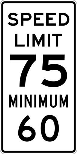 | Keywords: Speed Limit 75 Minimum 60 sign.svg 600 mm by 1200 mm 24 in by 48 in Combined Speed Limit sign made to the specifications of the http //mutcd fhwa dot gov/SHSm/regulatory pdf 2004 edition of Standard Highway Signs sign R2-4a Uses the http //www triskele com/fonts/index html Roadgeek 2005 fonts United States law does not permit the copyrighting of typeface designs and the fonts are meant to be copies of a U S Government-produced work anyway The outside border has a width of 1 1 mm and a color of black so it shows up; in reality signs have no outside border own Ltljltlj User Ltljltlj/Template minimum R2-4 - Minimum Speed 7560 60 number 75 number |