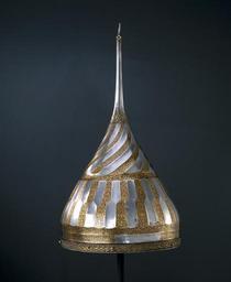 | Keywords: Spetsig hjälm, troligen persisk - Livrustkammaren - 47952.tif LSH artwork sv Spetsig hjälm med oval klocka invändigt klätt med stoppning av rött atlassiden med dekorsömmar i fiskbensmönster Utvändig dekor Nertill en ca 15 mm bred ring av förgylld mässing med höga skarpa kanter och därinnanför pärlstavskantbårder omgivande en bladbård i mitten Ringen fäst med 15 nitar med kulformiga huvuden varav fyra återstår Därovanför två skålade band i stålet b ca 15 mm det övre helt täckt av påslagen rankdekor av guld på det nedre samma dekor i fyra fält med rundade ändar Därovanför smalnar hjälmklockan av uppåt Därpå ett 90 mm brett dekorband sammansatt av ca 15 mm breda stavar i två rader med sicksackformig avgränsning mellan raderna så att den övre raden är halvt förskjuten i förhållande till den nedre På två angränsande stavar i de två raderna dekor som tidigare Därovanför en skålad ring med rankdekor Hjälmklockans övre del dekorerad med 18 spiralvridna skålade fält vartannat med gulddekor Överst en ca 35 mm bred ring med gulddekor avslutad vid spetsskarven Spets l 155 mm d nertill 19 mm och avsmalnande uppåt avslutning upptill med en fasetterad kula med skålade fördjupningar c ca 10 mm och därovanför en något böjd spets l 22 mm Nedanför kulan ett mycket slitet fält med gulddekor original caption Spetsig hjälm troligen persisk <br/> Nyckelord Hjälmar Föremålsbild 1500-tal Erövringen av Warszawa Stora oredan<br/> Stora oredan Moskwa mid other date century 16 steel - silk Färg röd material sidenatlas - brass - gold size mm 220 största g 1280 size mm 210 minsta size mm 410 LRK Karl XI av Sverige Persisk konst i Sverige 1973 Livrustkammarens basutställning 1978 Gustav II Adolf 350 år efter Lützen 1982-1984 Islamiskt i de kungliga samlingarna 1984 Kungens lockpipa 1995-1996 Karl XII och Peter den store Peter den store och Karl XII - i krig och fred 1998-1999 Livrustkammaren Krigsbyte 2007-2008 basutställning basutställning place of origin original filename lm_t09862 56956 inventory number LRK 20388 47952 CC-BY-SA Battle of Warsaw 1656 Military helmet images from Livrustkammaren Media contributed by LSH unmatched event Media contributed by LSH dim-with multiple size templates Media contributed by LSH unmatched keyword Media contributed by LSH 2014-11 |