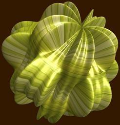 | Keywords: mathematica cg 3d sphericalplot3d texture code program algorithm コード プログラム アルゴリズム geometric sculpture geometricsculpture shape geometry sculpture mapping テクスチャ マッピング 模様 もよう abstract 抽象 ちゅうしょう アブストラクト design pattern デザイン パターン graphic グラフィック グラフィクス structure 意匠 構造 symmetry 対称性 たいしょうせい シンメトリー 対称 たいしょう algorithm コード a = 2; b = 3; c = 5; SetOptions[SphericalPlot3D, Axes -> None, Mesh -> None, Boxed -> False, PlotStyle -> Directive[Specularity[White, 30], Texture[Import["D:/tmp/71.jpg"]]], TextureCoordinateFunction -> ({b #4, #5/c} &), Lighting -> "Neutral", Background -> Darker[Orange, 0.8], ImageSize -> 3000, PlotPoints -> 400]; g[v_] := Sum[Sin[(2 k - 1) v]/(2 k), {k, 3}]; SphericalPlot3D[a + Sin[b p] g[c q], {p, 0, Pi}, {q, 0, 2 Pi}] (*--- The Texture *) a = 2; b = 3; c = 5; SetOptions[SphericalPlot3D, Axes -> None, Mesh -> None, Boxed -> False, PlotStyle -> Directive[Specularity[White, 30], Texture[Import["D:/tmp/71.jpg"]]], TextureCoordinateFunction -> ({b #4, #5/c} &), Lighting -> "Neutral", Background -> Darker[Orange, 0.8], ImageSize -> 3000, PlotPoints -> 400]; g[v_] := Sum[Sin[(2 k - 1) v]/(2 k), {k, 3}]; SphericalPlot3D[a + Sin[b p] g[c q], {p, 0, Pi}, {q, 0, 2 Pi}] (*--- The Texture *) |