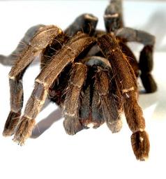 Keywords: spider tarantula arthropod photography hairy mexican redknee tarantula brown orange carapace color image female abdomen studio shot white background legs ground venomous birdman animal