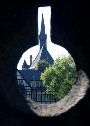 Keywords: spire church steeple by looking andernach catholic stone hole opening tree