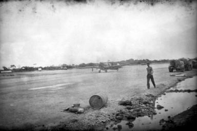 | Keywords: Spitfire Vc of 79 Sqn RAAF at Kiriwina 1943.jpg Kiriwina Trobriand Islands Papua November 1943 Supermarine Spitfire Mk Vc No A58-137 code UP-T RAF EE835 with No 79 Squadron RAAF taxiing on the airfield with a 90 gallon auxiliary fuel drop tank and with an airman on the mainplane to guide the pilot in accordance with No 73 Wing Standing Orders UP-T was the personal aircraft of 407174 Flight Lieutenant D H David Hopton a Flight Commander Nose art on the port engine cowling depicted the nude figure of a girl with her pants down with the nickname Down with everything The Consolidated PBY Catalina flying boat aircraft of the U S Navy in the background was used to rescue Allied airmen downed in the Solomon Sea during operations over New Britain from Kiriwina and mainland New Guinea bases e g Dobodura and Port Moresby P02874 119 1943-11 William H Robinson Australian armed forces Image copyright Copyright expired - public domain frame cropped PD-Australia Supermarine Spitfire Mark V No 79 Squadron RAAF Supermarine Spitfire in Australian service Trobriand Islands |