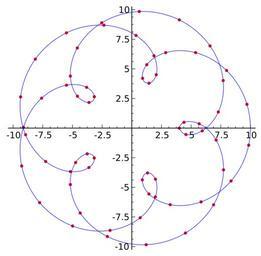 | Keywords: Splined epitrochoid.svg Created with Sage Made with Sage; code is as follows <source lang python > Five-petaled epitrochoid via splining the points Draw an epitrochoid fixed circle radius R rotating circle of radius r pen at distance d from center of rotating circle R 5 r 2 d 3 rotations R + r / r denom v step 0 2 for t in srange 0 2 pi rotations step v append R + r cos t - d cos R + r / r t R + r sin t - d sin R + r / r t x_spline spline RDF i / len v vi0 for i in range len v + 1 v00 y_spline spline RDF i / len v vi1 for i in range len v + 1 v01 show points v rgbcolor 1 0 0 pointsize 10 + parametric_plot x_spline y_spline x 0 1 thickness 0 5 figsize 4 4 ticks 2 5 2 5 xmin -10 </source> Splined_epitrochoid png 50 2012-01-29 08 20 UTC Splined_epitrochoid png dino derivative work <font color blue size 2px >Inverse</font><font color 6495ED size 2px >Hypercube</font> Vectorized Splined_epitrochoid png en English Wikipedia dino Original upload log This image is a derivative work of the following images File Splined_epitrochoid png licensed with PD-user-w 2010-07-25T20 52 50Z Aleksd 400x400 27936 Bytes <nowiki> made with SAGE; code follows Five-petaled epitrochoid via splining the points Draw an epitrochoid fixed circle radius R rotating circle of radius r pen at distance d from center of rota</nowiki> Uploaded with derivativeFX Images with Sage source code Interpolation Epitrochoid |
