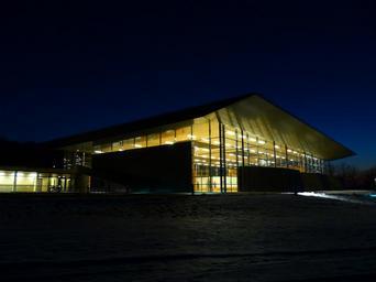 Keywords: sports hall gym sports center lighting at night building architecture warehouse roof glass glass construction window