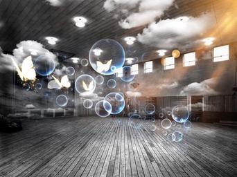 Keywords: sports hall soap bubbles surreal clouds heavenly ease dance large black white bright wood floor planks air airy sport fly float window