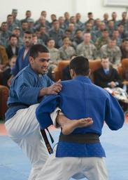 | Keywords: Sports Improve Police DVIDS389774.jpg en Martial artists from local clubs demonstrate their skills during the opening ceremony for a gym serving the Shamshad 202 Zone Police Corps in Kabul Afghanistan April 13 The Ministry of Interior and its NATO Training Mission-Afghanistan partners are hoping to ingrain sports and fitness into the Afghan policing community to build leadership character discipline and teamwork 2011-04-13 Petty Officer 2nd Class Ernesto Hernandez Fonte https //www dvidshub net/image/389774 110413-N-+++++-143 2011-04-14 14 41 KABUL AF PD-USGov-Military-Navy NATO Training Mission - Afghanistan Images from DoD uploaded by Fæ |