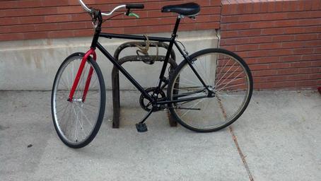 | Keywords: bike vehicle bicycle seat Spotted an unknown make of single speed bike at the city library. Had a good set of wheels and an aluminum crank, plastic pedals, tough lookin' fork, comfortable bars, and a well padded seat. Guessing it belonged to a high school student. I liked it. Basic, but nothin' wrong with basic. Single rear brake caliper is usually put on the front, still, it works. What the heck. Spotted an unknown make of single speed bike at the city library. Had a good set of wheels and an aluminum crank, plastic pedals, tough lookin' fork, comfortable bars, and a well padded seat. Guessing it belonged to a high school student. I liked it. Basic, but nothin' wrong with basic. Single rear brake caliper is usually put on the front, still, it works. What the heck. |