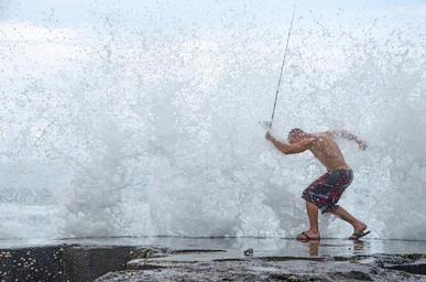 Keywords: spray water sea man swimming trunks fish strong trained young man male happy dreamy attractive bali side red crazy pose holidays flip flops lion's mane mussels stone ebb rocks decorative ground nature mussel shells holiday