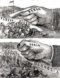 | Keywords: Spre sciinţă Bulgarilor din Dobrogea, Bobârnacul, 28 sept 1878.jpg en Spre sciinţă Bulgarilor din Dobrogea A Message to the Bulgarians of Dobruja anti-Bulgarian engraving in the Romanian magazine Bobârnacul Published shortly after Russia and Romania defeated the Ottoman Empire on the Bulgarian war theater Romania also extended her rule into Dobruja but met resistance from the sizable Bulgarian community in that area; some Romanians were puzzled since they believed Bulgarians should have thanked Romania for having contributed to Bulgaria's liberation <br>In the first panel a large hand representing Romanian realpolitik flicks away the Ottomans occupying Plevna Redoubt - a visual reference to the essential Romanian battle on the Bulgarian theater In the second panel it forms a fist crashing into Dobruja and scattering the Bulgarian malcontents <br>The original caption reads Românul la Plevna spre a vĕ scăpa de sclavia Turculuĭ 'şi-a arĕtat numaĭ degetul şi Plevna s'a supus In Dobrogea de vĕ veţi rescula Românul 'şĭ va arĕta în numele Europeĭ PUMNUL şi Dobrogea se va supune In Plevna where he was liberating you from slavery to the Turk the Romanian has merely had to show his finger and Plevna submitted Should you be rebelling in Dobruja the Romanian acting for Europe will pull out his FIST and Dobruja will submit Bobârnacul 62/1878 accessible through http //digitool dc bmms ro 8881/R RN 709438175 DacoRomanica Bucharest City Library unknown/uncredited 1878-09-28 Bobârnacul Imperialism Siege of Plevna in art Dobruja Bulgarian diaspora Fists in art 1878 in Romania 1878 in Bulgaria 1878 in military history Political cartoons of Romania 1870s political cartoons 1878 cartoons 1878 engravings PD-Art |
