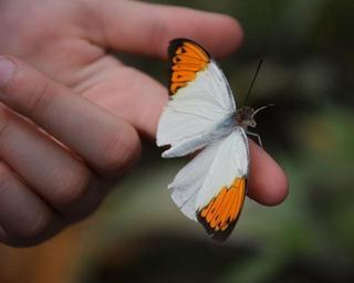 Keywords: spreading wings butterfly tropical house butterfly house wing nature insect finger landed rest orange white
