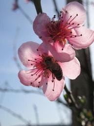 Keywords: spring flower tree branch blossom pink tree branches bloom sky cherry tree branch cherry blossom closeup bee cherry-tree pollination leaf sunny insect petal blooming
