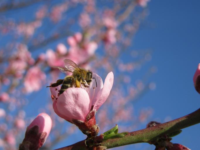 Keywords: spring flower tree branch blossom pink tree branches bloom sky cherry tree branch cherry blossom closeup bee cherry-tree pollination