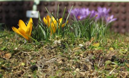 Keywords: spring flowers crocus yellow purple close signs of spring colorful blossomed