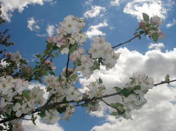 Keywords: spring flowers sunshine blue sky clouds white flower sunbeam ray of light apfelbluehte light spectrum light beam sun light