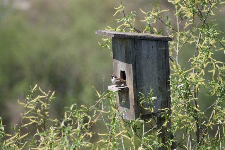 Keywords: spring nature birdhouse sparrow bird against sky
