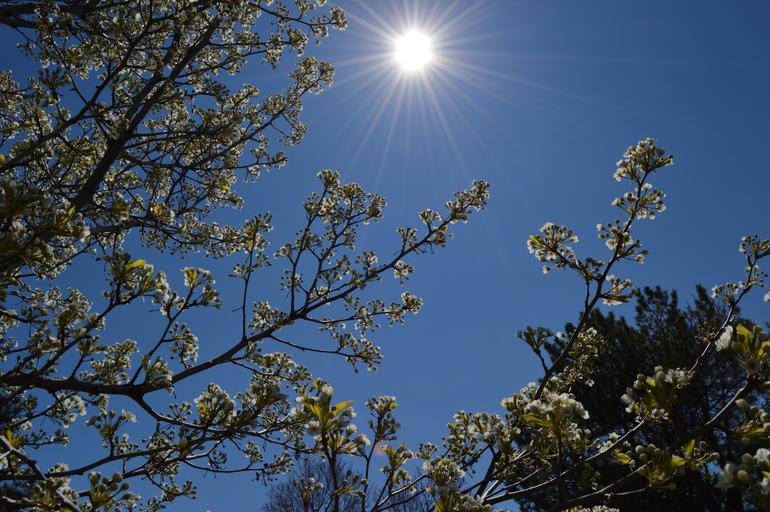 Keywords: spring sky sun day tree branches sunny sunlight happiness blue sunny day blue sky blossom