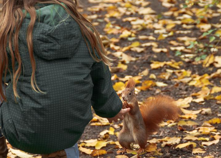 Keywords: squirrel animals autumn feed feeding trustful cute child hand give parts