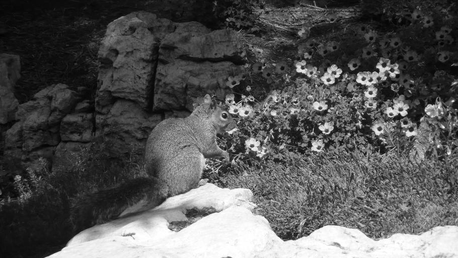 Keywords: squirrel park stone rock flower season black white animal