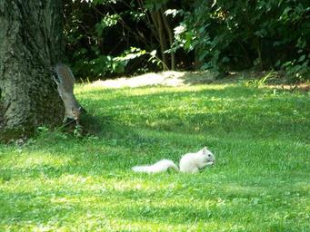 Keywords: squirrels white brown animals mammals two pair park trees grass lawn green background climbing down woods moving fast playful small wildlife rodents outdoors gardens
