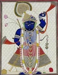 | Keywords: Sri nathji.jpg en The blue-skinned god Krishna is shown dressed in a patterned robe and bedecked with jewels and garlands standing before a cloth of white floral material Originally from Nathdwar Temple Rajasthan http //collections vam ac uk/item/O82745/painting-krishna-as-srinathji/ unknown author late 19th century made PD-art 2011-12-08 Shrinathji |