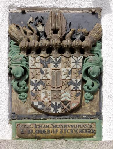 Keywords: Srokowo Ratusz 004.JPG Srokowo Johann Sigismund Kurfürst und Markgraf von Brandenburg sowie Herzog und Mitregent von Preußen am Rathaus in Srokowo dt Drengfurth 1945-1950 Dryfort own Janericloebe 2010-08 Town hall in Srokowo Johann Sigismund Brandenburg Coats of arms of Brandenburg Coats of arms of the house of Hohenzollern Coats of arms of Prussia Coats of arms of Duchy of Crossen Coats of arms of Duchy of Krnov |