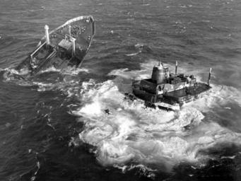 | Keywords: SS ARGO MERCHANT DISASTER DVIDS1082121.jpg en NANTUCKET Mass July 2000 --The two halves of the SS Argo Merchant swirl in a sea of foam before being sucked under The tanker broke into two pieces Dec 21 1976 after running aground six days earlier on its way to Salem Mass with a load of 7 3 million gallons of heavy industrial fuel oil The 644-foot 18 743-ton Liberian-flagged tanker ran aground Dec 15 in international waters 28 miles southeast of Nantucket Island causing a major spill Helicopters from Coast Guard Air Station Cape Cod Mass lifted the 38 crewmembers to safety Dec 15 and 16 Photo courtesy of Coast Guard Historian 2000-06-30 https //www dvidshub net/image/1082121 1082121 2013-12-11 19 30 NANTUCKET MA US PD-USGov Coast Guard Air Station Cape Cod Images from DoD uploaded by Fæ |
