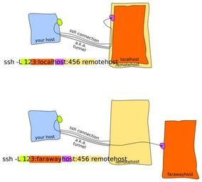 | Keywords: Ssh-L-tunnel.svg en -L specifies that the given port on the local client host is to be forwarded to the given host and port on the remote side via ssh The ssh command is executed on the blue computer own 2014-03-07 Erik Streb Computer network diagrams SSH Cc-zero |