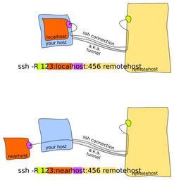 | Keywords: Ssh-R-tunnel.svg en -R specifies that the given port on the remote server host is to be forwarded to the given host and port on the local side via ssh The ssh command is executed on the blue computer own Erik Streb 2014-03-07 Computer network diagrams SSH Cc-zero |