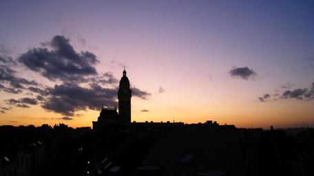 Keywords: st gilles church sunset glow sky orange purple clouds bruxelles commune