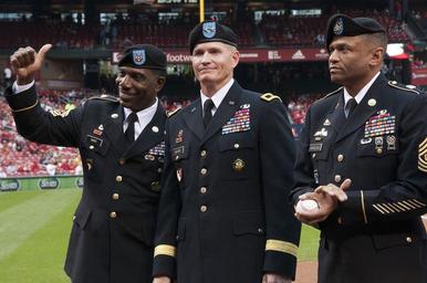 | Keywords: St. Louis Cardinals annual Military Appreciation Day pre-game event 150926-N-II118-037.jpg en 150926-N-II118-037 ST LOUIS Sept 26 2015 From left Command Sgt Maj Roy Ward command sergeant major Fort Leonard Wood Maj Gen Kent Savre commanding general Fort Leonard Wood and Command Sgt Maj Kevin McKeller command sergeant major Military Surface Deployment and Distribution Command wave to the crowd at Busch Stadium during the St Louis Cardinals annual Military Appreciation Day pre-game event U S Navy photo by Mass Communication Specialist 1st Class Latrice Jackson/Released <br>Unit Navy Media Content Services 2015-09-26 Petty Officer 2nd Class Latrice Ames https //www dvidshub net/image/2202348/st-louis-cardinals-annual-military-appreciation-day-pre-game-event 150926-N-II118-037 2015-09-30 03 54 ST LOUIS MO US PD-USGov-Military-Navy Fort Leonard Wood Military Appreciation Day Images from DoD uploaded by FĂŚ |