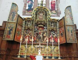 | Keywords: St Matthews Douglas 1.jpg en Working with John Loughborough Pearson Nathaniel Hitch carved the reredos for St Matthew ™s Church in Douglas in the Isle of Man shown here The work was finished in March 1916 It is in the form of a triptych carved in wood decorated in gesso gilded and painted It is 13 feet high from the Altar step to the top of the cornice and 14 feet across the wings The design is intended to illustrate the Doctrine of the Incarnation and the central subject consists of a representation of the Adoration of the Magi; carved in high relief In the centre is the Virgin Mother seated under a curtained canopy with the Holy Child on her knee and grouped around the three kings in attitudes of adoration presenting their gifts with Saint Joseph in the background In the panels on either side are soldiers and servants attending the kings In the top panel is the figure of our Lord seated in Majesty with hands extended in blessing and on either side angels with censers On the wings are figures executed in gesso The lower panel represents St Matthew in whose honour the Church is dedicated then St Clement St Ignatius and St Polycarp the three sub-apostolic Fathers The Predella is decorated in gesso work with four angels holding shields bearing the instruments of the Passion on a richly decorated background On the moulded base is the text Et incarnatus est de Sancto Spiritu own Weglinde Gordon Lawson Cc-zero Sculptures by Nathaniel Hitch Douglas Man |