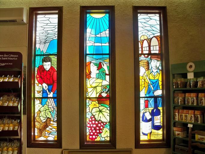 Keywords: St Maurice - Vitraux Caves.JPG fr Vitraux de la cave de Saint Maurice sur Eygues Drôme France own Véronique PAGNIER 2010-08-08 Saint Maurice AOC Stained glass windows in Drôme Grapes on stained glass windows Taken with Kodak EasyShare Z950
