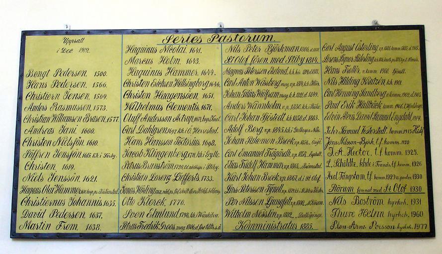 Keywords: St Olof series pastorum.jpg Sankt Olofs Kirke i Skåne Præstetavle own Own photo 2007-07 Gunnar Bach Pedersen PD Interior of Sankt Olofs kyrka Österlen Series Pastorum GunnarBach 2007 in Simrishamn Municipality July 2007 in Sweden Churches in Sweden photographed in 2007 |