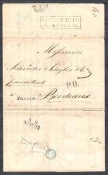 | Keywords: St Petersburg 1848 Dob0102306.jpg en Russia stampless folded letter to France 'St PETERSBURG DEN 24 IAN 1848 ' boxed cancel manuscript 'franco tout' Black 'P D ' straight line 'AUS RUSSLAND FRANCO' French 'PRUSSE VALENCIENNES 15 FEVR 48' c d s Transit postmark Paris and Bordeaux 17 FEVR 48 arrival Details January 24 1848 Julian paid letter posted at St Petersburg Sender wrote 'franco tout' Not restated at post office The postmark 'St PETERSBURG DEN 24 IAN 1848' was applied Dobin 1 02 type 3 06 Reception expedition of foreign correspondence used 1844-1853 Rarity 4 <ref> cite book Manfred Dobin Postmarks of Russian Empire Pre adhesive period St Petersburg Standard Kollektion 1993 9785853870222 </ref> February 11 Gregorian 'BERLIN 11 2' typical Berlin transit postmark and 'AUS RUSSLAND FRANCO' applied Based on the usual presence of these Berlin postmarks this 'AUS RUSSLAND FRANCO' marking is regarded as a Berlin mark White Aus Russland type B3 February 15 red 'PRUSSE VALENCIENNES 15 FEVR 48 3' French entry mark at Valenciennes 3's show the postmark was struck at Paris Letter was also marked by the French with 'P D ' Payee au Destination Noël 1021<ref> cite book Gilbert Noël Catalogue des oblitérations des chiffres-taxe carrés de France 1859-1878 1956 Paris E H de Beaufond </ref> February 15 blue 'PARIS 15 FEVR 48 60 ' transit postmark February 17 'BORDEAUX 17 FEVR 48 32 ' arrival backstamp 1848 Scan of original Postal authorities Sources reflist PD-old-100 Stampless covers of Russia Marque d'entrée en France Gare de Valenciennes Postmarks of Saint Petersburg Entry and transit postmarks of Germany 1848 postmarks |