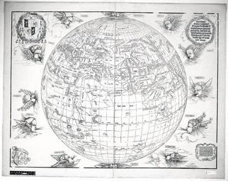 | Keywords: Stabius map of the world.jpg en Carl Ritter's 1847 impression of Johann Stabius's 1515 world map whose engraving is credited to Albrecht Dürer A planisphere globe surrounded by the twelve winds equivalent to Ptolemy's third projection The arms of Matthäus Cardinal Lang von Wellenburg archbishop of Salzburg at upper left; the arms of Johann Stabius imperial astrologer at lower left Dedication to Cardinal Lang at upper right; imperial privilege and date at lower right 63 9 x 85 0 cm Presented to the British Museum by the Austrian Imperial Library in Vienna in November 1848 la Reverendiss domino et illustriss Principi Dño Matheo T Angeli Diacono Cardinali Gurceñ Sa Caẽs Mtis per Italia locũtenenti generali vdño suo colen Joañ Stabius Au hãc orb imaginem dedicat Imp Caes niuus Maximilianus P F Aug Privilegio caiut nequis Libros membraenas cartas pictu'as volumĩa vel quecuqe alia que Ioan Stabius Au sub suo titulo nomie emiserit sine sua expressa voluntate In decem annis a die editioĩs sequentibus imprimat sub pena amissionis rerum impressarum decem mâcharum auri puri 1 5 1 5 1847 http //www britishmuseum org/research/collection_online/collection_object_details aspx objectId 1522306 partId 1 people 127877 from ad fromDate 1514 to ad toDate 1516 page 3 British Museum 1848 1111 8 Johann Stabius after Ptolemy al other versions <gallery> Stabius map of the world II jpg File Stabius-Durer world map jpg </gallery> PD-old-70-1923 1840s maps of the world 1847 maps Maps in Latin Stabius world map 1847 Carl Ritter Collections of the British Museum |